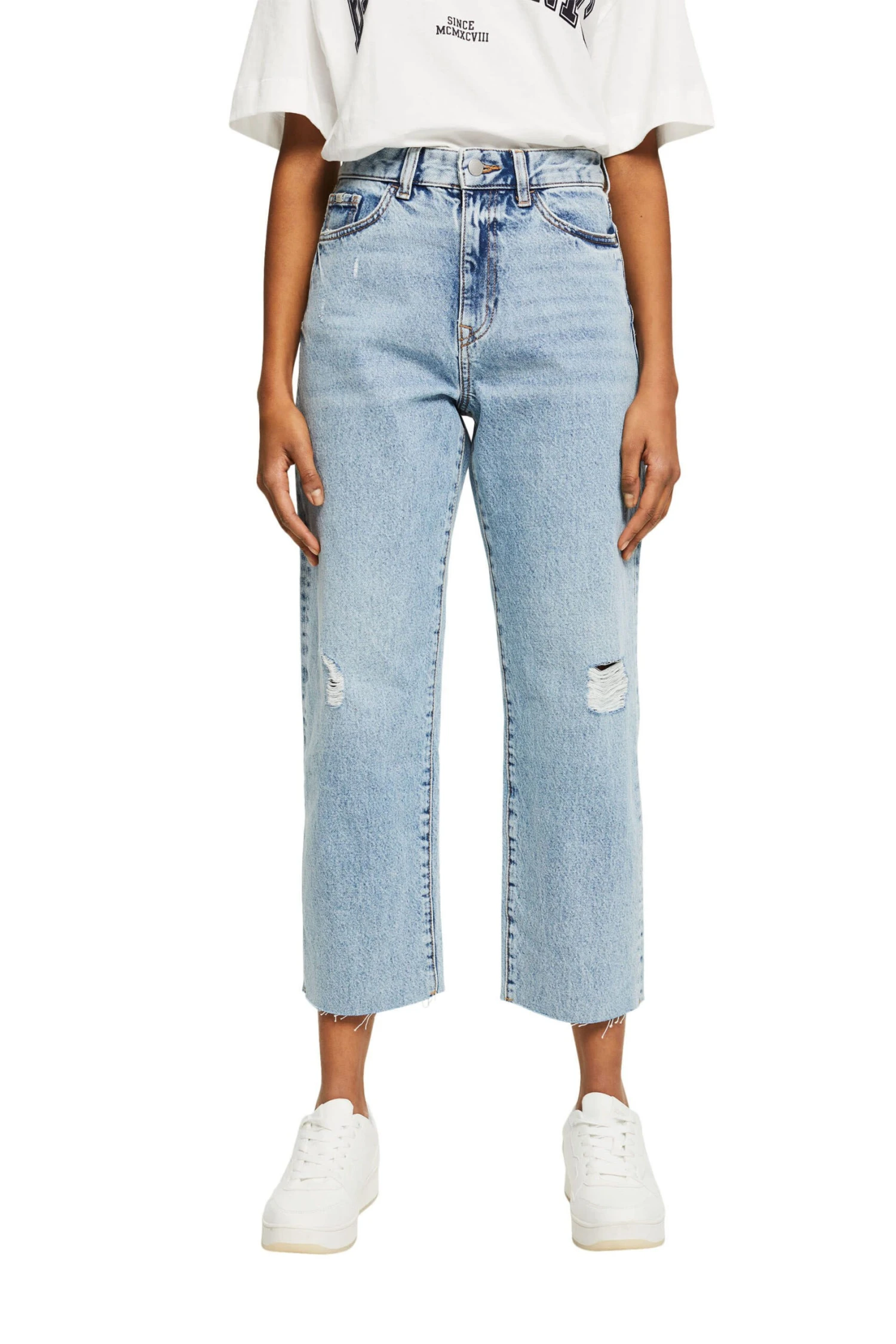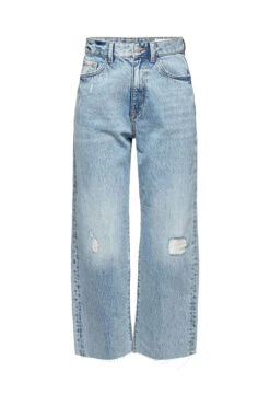 * Denim aus recycelter Baumwolle * Denimstärke: schwer * Bund mit Schlaufen, Knopf und Reißverschluss * Klassischer 5 Pocket Style * Lässige Destroyed-Effekte * Offener, leicht ausgefranster Saum * Gerades, verkürztes Bein Pflegehinweise: 40°C Buntwäsche, Nicht bleichen, Schonende Trocknung, Nicht heiß bügeln, Nicht trockenreinigen
