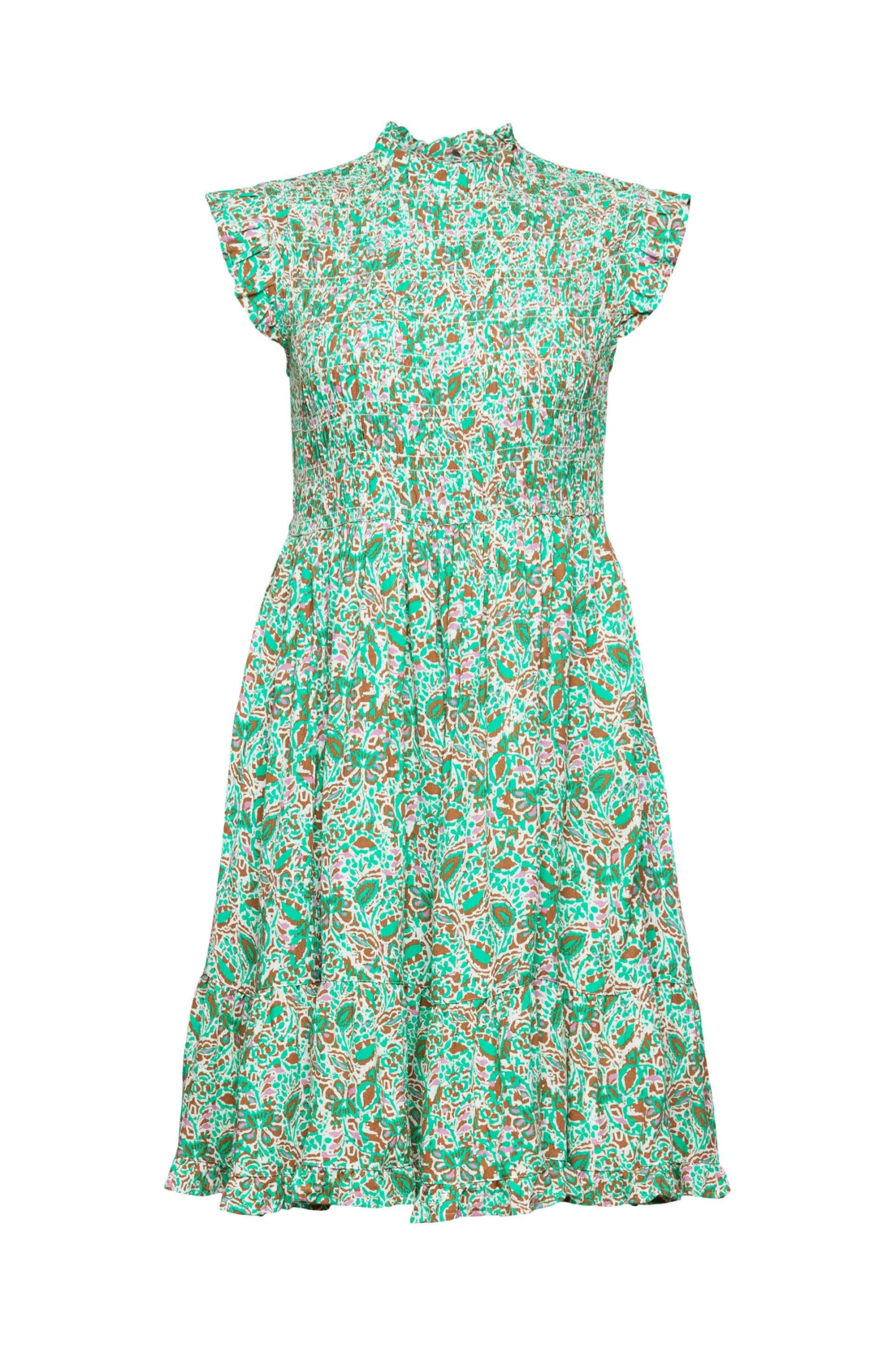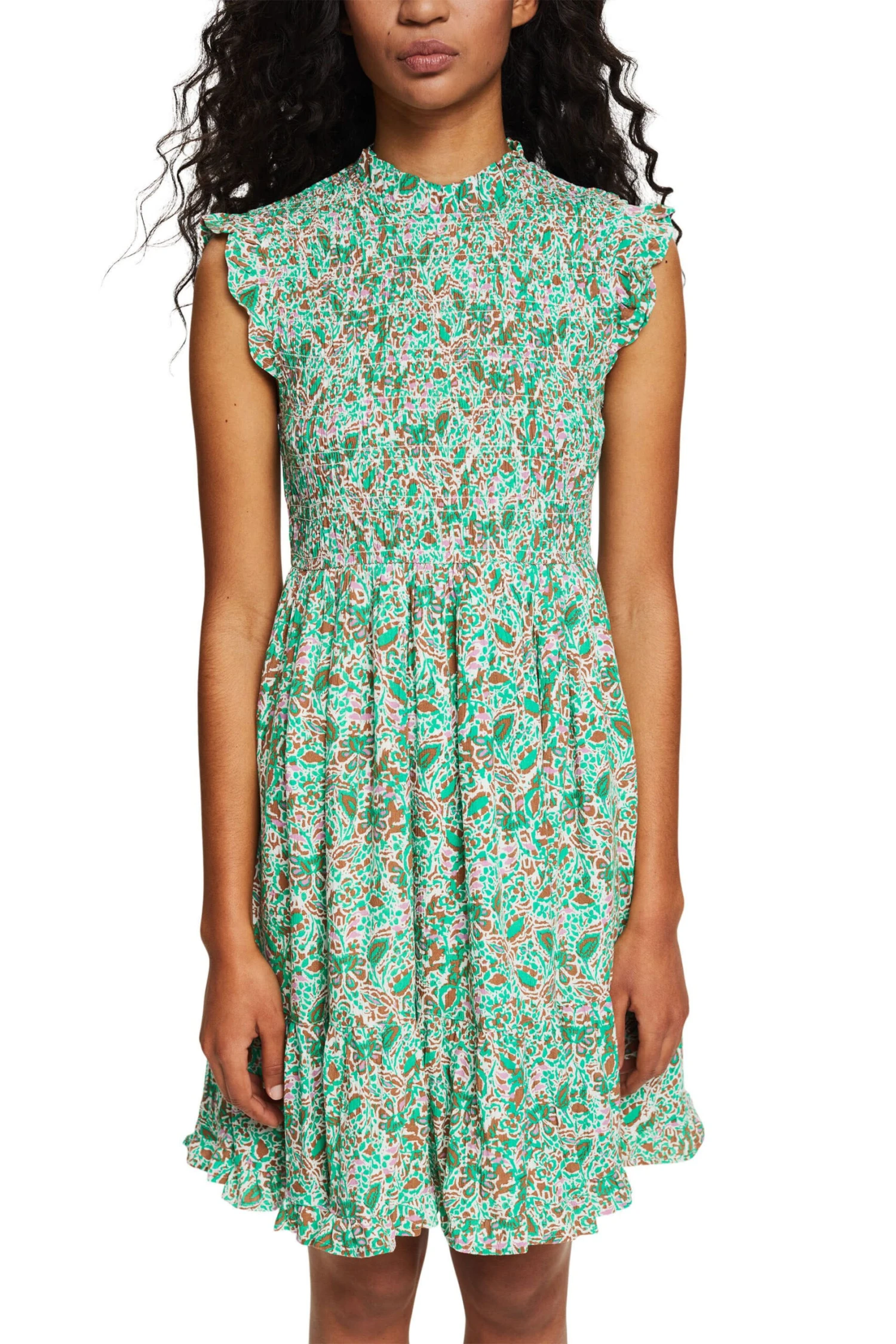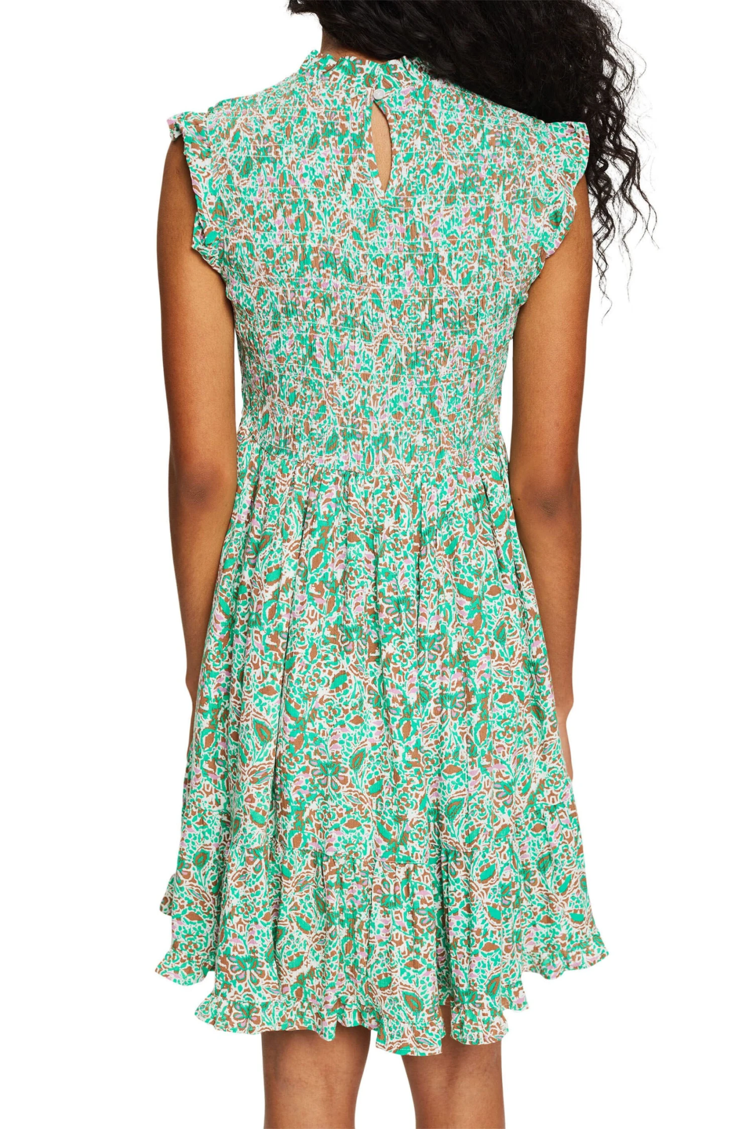 * Fließender Webstoff aus 100% LENZING™ ECOVERO™ * LENZING™ ECOVERO™: Viskose-Fasern, die aus nachhaltigem Holz und Zellstoff gewonnen werden und aus zertifizierten und kontrollierten Quellen stammen * Allover gemustert * Rundhalsausschnitt mit Rüschenkante und geknöpftem Keyhole im Nacken * Rüschenkante an den Ärmelenden * Elastisch gesmoktes Oberteil * Schwingender Rock mit Volantsaum * Minilänge Pflegehinweise: 30°C Pflegeleicht, Nicht bleichen, Nicht im Wäschetrockner trocknen, Nicht bügeln, Nicht trockenreinigen