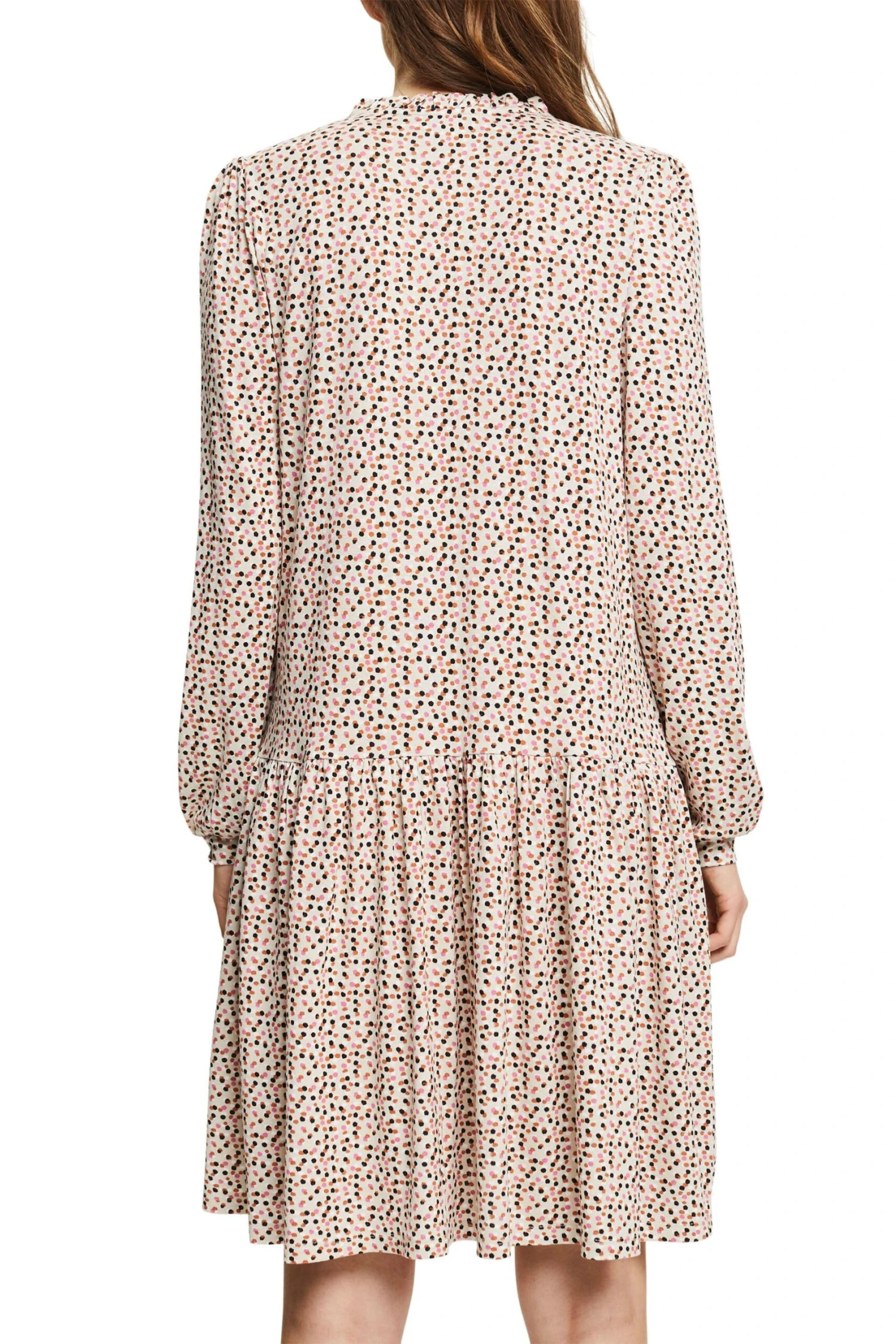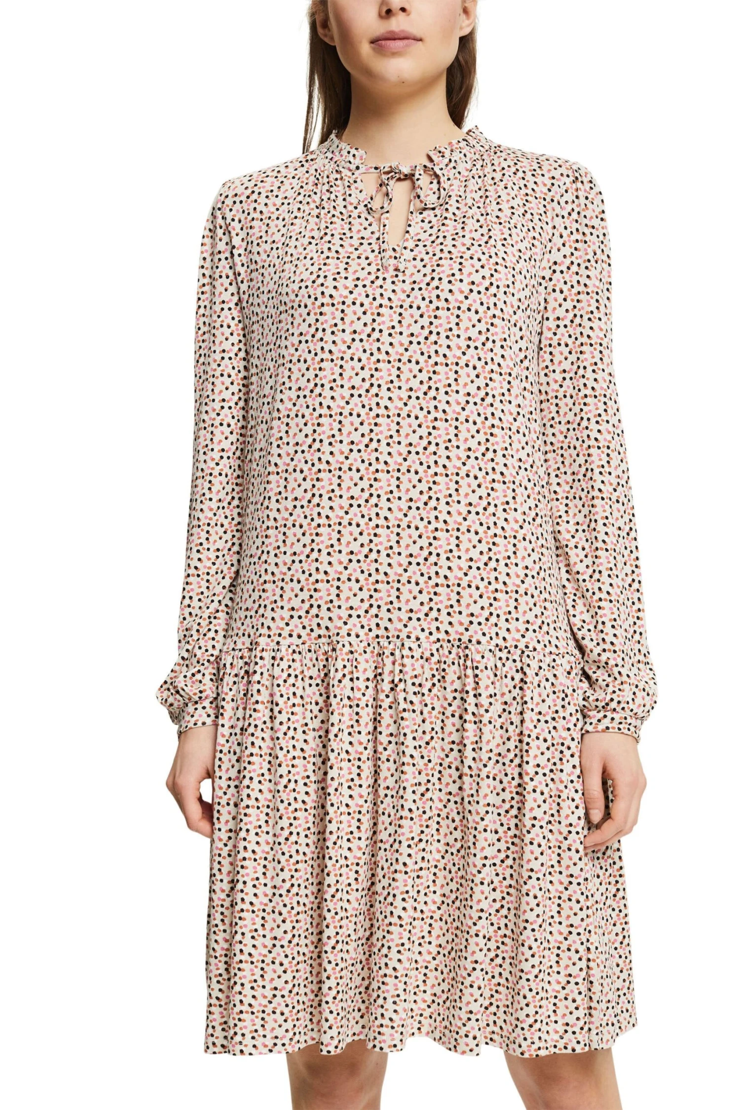 * Jersey aus nachhaltigen Viskose-Fasern und Stretchkomfort * LENZING™ ECOVERO™: Viskose-Fasern, die aus nachhaltigem Holz und Zellstoff gewonnen werden und aus zertifizierten und kontrollierten Quellen stammen * Kelchausschnitt mit fixiertem Bindebändchen und Rüschen-Details * Lange Ärmel mit Elastikbündchen * Locker umspielende A-Linie mit Volantsaum * Knielang Pflegehinweise: 30°C Pflegeleicht, Nicht bleichen, Nicht im Wäschetrockner trocknen, Mäßig heiß bügeln, Nicht trockenreinigen