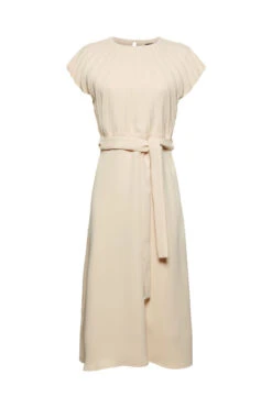 * Dichter Crêpe aus pflegeleichtem Garn * Plissiertes Oberteil mit angedeuteten Flügelärmeln * Verdeckter Reißverschluss an der Rückseite * Stoffeigener Bindegürtel * Ausgestelltes Rockteil in Midi-Länge Pflegehinweise: 40°C Pflegeleicht, Nicht bleichen, Nicht im Wäschetrockner trocknen, Mäßig heiß bügeln, Behandlung in Reinigungsmaschine mit folgenden Lösemitteln: Perchlorethylen, Kohlenwasserstoffe